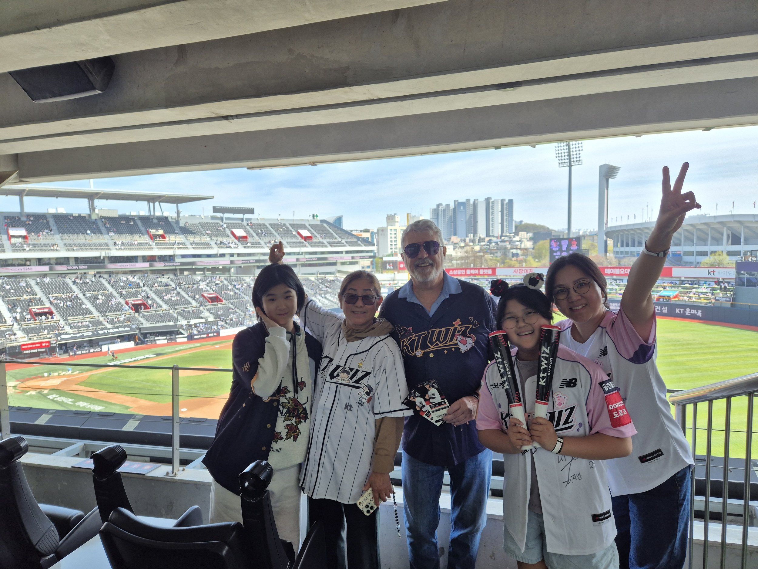When we arrived at the stadium, we bypassed the lines and went straight to our Sky-Box, one of several that KT offers to its employees as an occasional perk. My niece offered me an extra team jersey to wear since I didn’t have one of my own. I contemplated buying one for myself, but the line to even get into the merchandise store wrapped around the building,